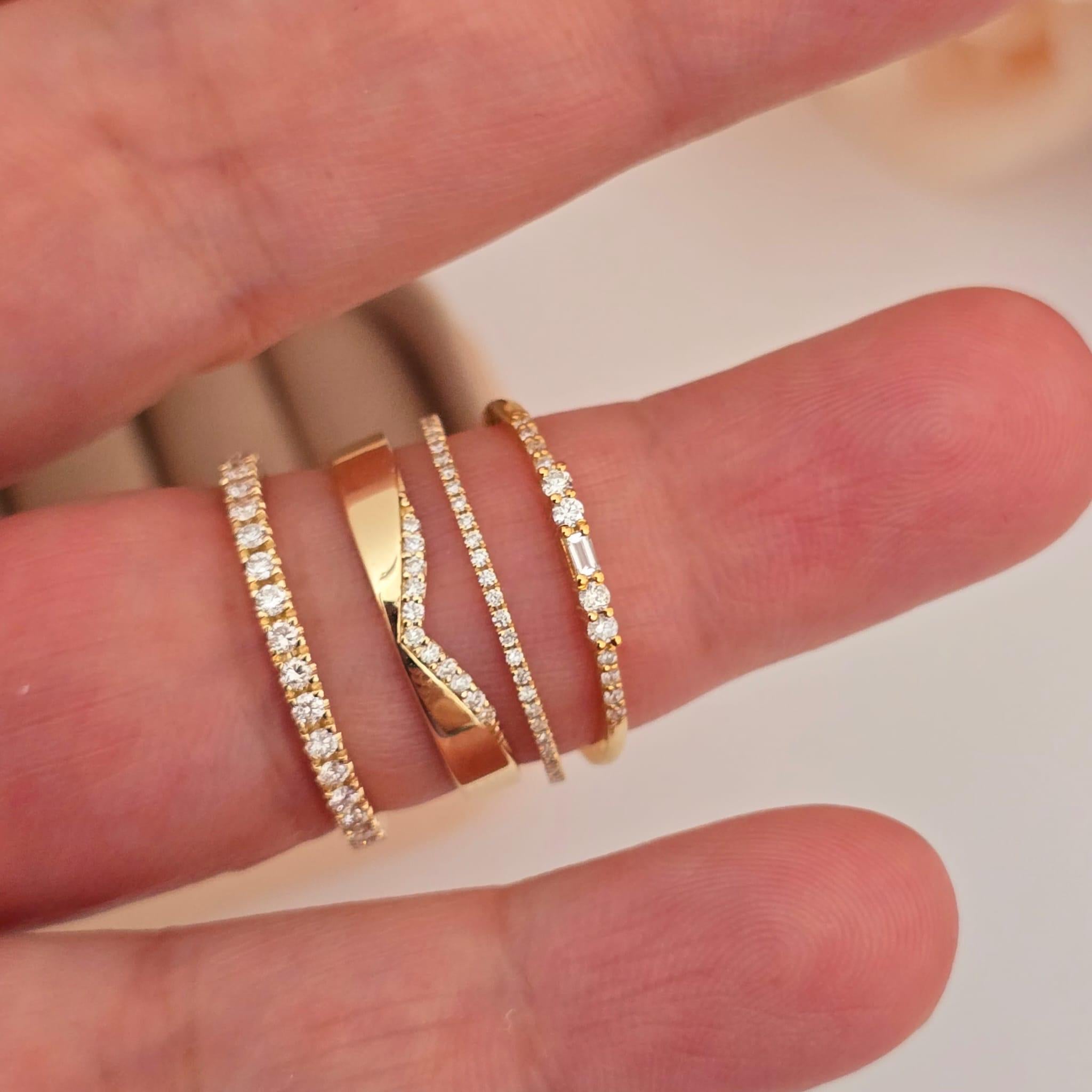 Made from solid 14K gold (available in yellow, white, or rose), this stacking wedding ring is ideal for brides looking for a dainty, modern curved band with a touch of sparkle. Whether worn alone, stacked with other rings, or as a unique wedding band, its classic design offers versatility for everyday elegance or special occasions.