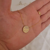The "Lunar Dreams" pendant, crafted from 14 carat gold, captures the essence of a moonlit sky. Its circular form symbolizes the full moon, surrounded by genuine diamonds that resemble stars in a gentle descent. This celestial dance is elegantly presented on a fine chain, merging the allure of the night with timeless sophistication. A piece that whispers tales of the cosmos, it's an emblem of beauty and the eternal connection between the moon and stars.