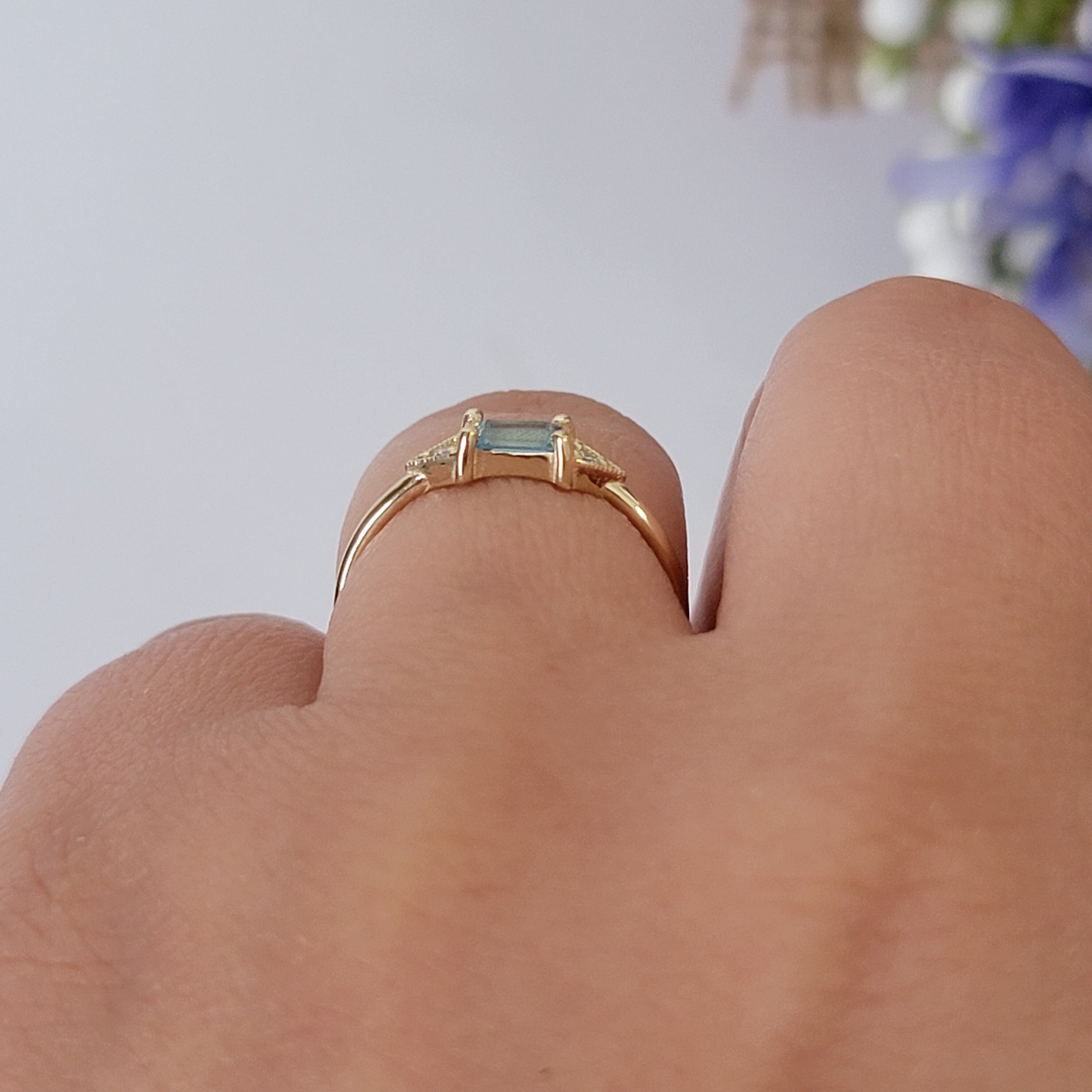 14k Gold Aquamarine Diamond Ring: Emerald Cut Birthstone Stacking Band